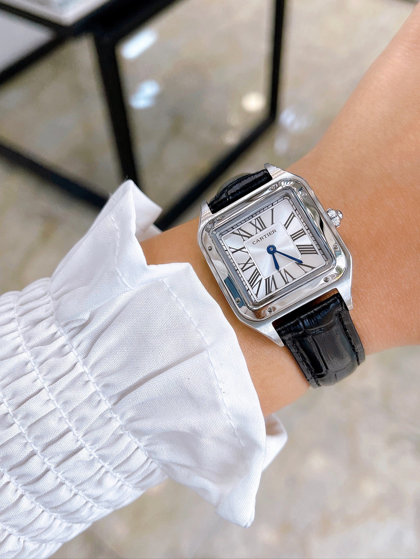 ساعت کارتیه زنانه دومونت بند چرم مشکی قاب استیل صفحه سفید